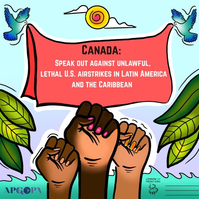 Common Frontiers and the Americas Policy Group sent a letter last month to Foreign Affairs Minister Anand and other ministers calling on the Canadian government to use all diplomatic means to publicly condemn and call for a halt to U.S. airstrikes on civilian boats in Latin America and the Caribbean.
